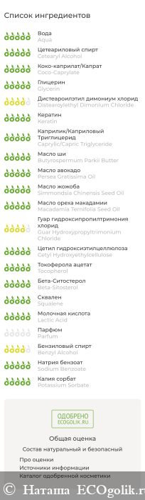 Aqua (Вода), Cetearyl Alcohol (Цетеариловый спирт / эмульгатор), Coco-Caprylate (Коко каприлат / эмолент) , Glycerin (Глицерин), Distearoylethyl Dimonium Chloride (Дистеароилэтил димониум хлорид / кондиционер), Keratin (Кератин), Caprylic/Capric Triglyceride (Каприлик/каприк триглицериды / эмолент), Butyrospermum Parkii Butter (Масло ши), Persea Gratissima Oil (Масло авокадо), Simmondsia Chinensis Seed Oil (Масло жожоба), Macadamia Ternifolia Seed Oil (Масло макадамии), Guar Hydroxypropyltrimonium Chloride (Гуар гидроксипропилтримония хлорид / кондиционер), Cetyl Hydroxyethylcellulose (Цетил гидроксиэтилцеллюлоза / целлюлозный загуститель), Tocopherol, Beta-Sitosterol, Squalene (Токоферол, Бета-ситостерол, Сквален / природный антиоксидант), Lactic Acid (Молочная кислота), Parfum (Отдушка), Benzyl Alcohol, Sodium Benzoate, Potassium Sorbate (Бензиловый спирт, Бензоат натрия, Сорбат калия / консервант, разрешенный по стандарту COSMOS для производства органической косметики).