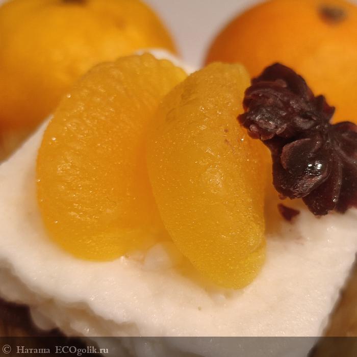 Мыльное пирожное невероятно похоже на изысканное кондитерское изделие. Бисквит искусно украшен дольками мандарина и звездочкой бадьяна. Натуральное мыло порадует восхитительным цитрусовым ароматом. Настоящее лакомство для гурманов!