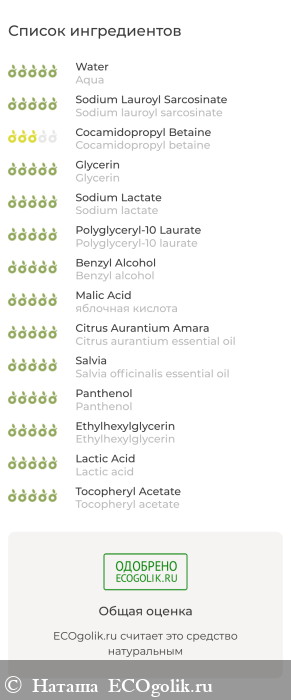 Aqua (вода дистиллированная), Sodium lauroyl sarcosinate (натрия лауроил саркозинат), Cocamidopropyl betaine (кокамидопропилбетаин), Glycerin (глицерин растительный), Sodium lactate (лактат натрия), Polyglyceryl-10 laurate* (полиглицерил-10 лаурат), Benzyl alcohol (бензиловый спирт), Мalic acid (яблочная кислота), Citrus aurantium essential oil (эфирное масло апельсина), Salvia officinalis essential oil (эфирное масло шалфея), Panthenol (Д-пантенол), Еthylhexylglycerin (этилгексилглицерин), Lactic acid (молочная кислота), Tocopheryl acetate (витамин Е).