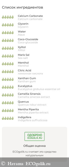Calcium carbonate (карбонат кальция), Glycerin (глицерин растительный), Aqua (вода дистиллированная), Coco-glucoside (кокоглюкозид), Xilitol (ксилит), Sea salt (соль морская), Menthol (ментол), лимонная кислота (Citric acid), Xanthan gum (ксантановая камедь), Eucalyptus globulus essential oil (эфирное масло эвкалипта), Camellia sinensis extract (экстракт зеленого чая), Quercus robur extract (экстракт коры дуба), Mentha piperita extract (экстракт мяты), Indigofera suffruticosa (корень индиго молотый).