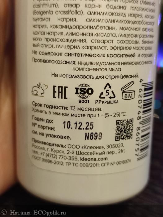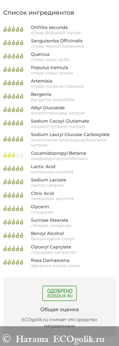 отвар боровой матки (Orthilia secunda), отвар черноголовника (Sanguisorba officinalis), отвар коры дуба (Cortex Quercus ), отвар коры осины (Populus tremula), отвар полыни горькой (Artemísia absínthium), отвар корня бадана толстолистного (Bergenia crassifolia) алкилглюкозид натрия, кокоилглутамат натрия, алкилполигликозидкарбоксилат натрия, кокамидопропилбетаин, молочная кислота, лактат натрия, лимонная кислота, глицерин, стеарат сахарозы, бензиловый спирт, глицерил каприлат, эфирное масло розы.