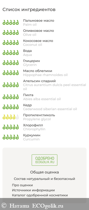 Palm oil (натриевые соли жирных кислот пальмового масла), Olive oil (оливкового масла), Coconut oil (кокосового масла), Aqua (вода дистиллированная), Glycerin (глицерин растительный), Hippophae rhamnoides oil (масло облепиховое), Citrus aurantium dulcis peel essential oil (эфирное масло апельсина), Abies alba essential oil (эфирное масло пихты), Cedarwood siberian essential oil (эфирное масло кедра), Propylene glycol (пропилен гликоль), Chlorophyllin (хлорофилл), Curcumin (куркумин).