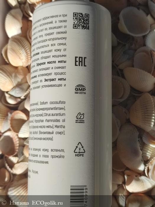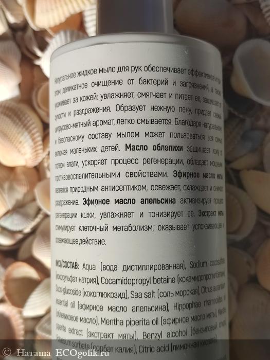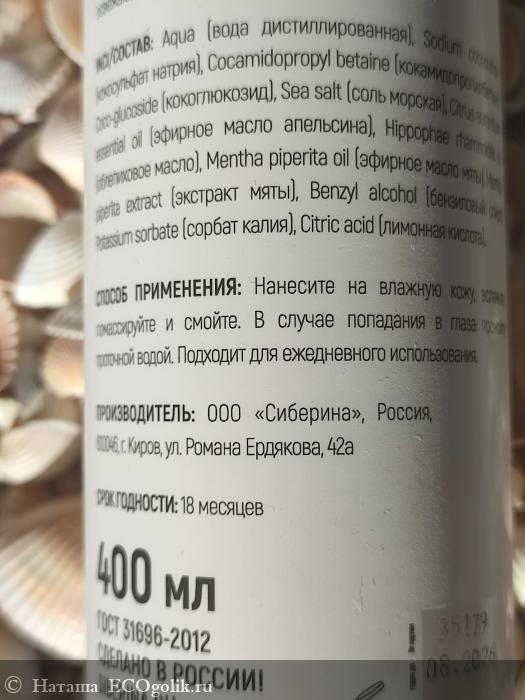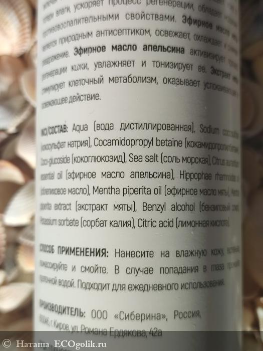 Aqua (вода дистиллированная), Sodium cocosulfate* (кокосульфат натрия), Cocamidopropyl betaine (кокамидопропилбетаин), Coco-glucoside (кокоглюкозид), Sea salt (соль морская), Citrus aurantium essential oil (эфирное масло апельсина), Hippophae rhamnoides оil (облепиховое масло), Mentha piperita оil (эфирное масло мяты), Mentha piperita extract (экстракт мяты), Benzyl alcohol (бензиловый спирт), Potassium sorbate (сорбат калия), Citric acid (лимонная кислота).