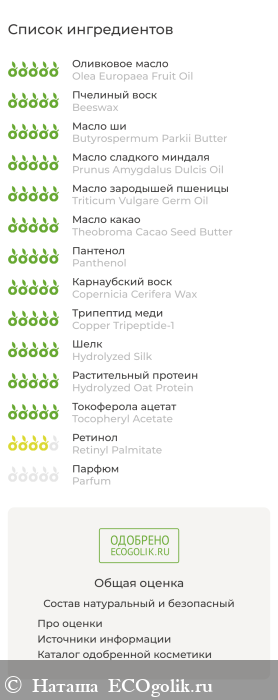 Olea Europaea Fruit Oil, Beeswax (Пчелиный Воск), Butyrospermum Parkii Butter (Масло Ши), Prunus Amygdalus Dulcis Oil, Triticum Vulgare Germ Oil, Theobroma Cacao Seed Butter, Panthenol (Пантенол), Copernicia Cerifera Wax, Copper Tripeptide-1, Hydrolyzed Silk, Hydrolyzed Soy Protein, Hydrolyzed Oat Protein, Tocopheryl Acetate, Retinyl Palmitate, Parfum.