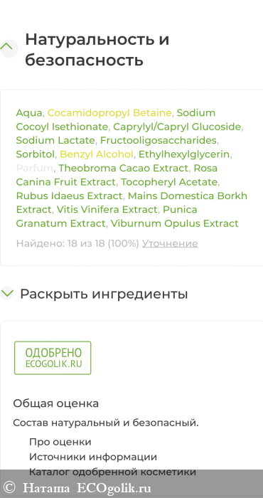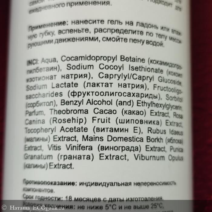 Aqua, Cocamidopropyl Betaine (кокамидопропилбетаин), Sodium Cocoyl Isethionate (кокоил изотионат натрия), Caprylyl/Capryl Glucoside, Sodium Lactate (лактат натрия), Fructooligosaccharides (фруктоолигосахариды), Sorbitol (сорбитол), Benzyl Alcohol (and) Ethylhexylglycerin, Parfum, Theobroma Cacao (какао) Extract, Rosa Canina (Rosehip) Fruit (шиповника) Extract, Tocopheryl Acetate (витамин Е), Rubus Idaeus (малины) Extract, Mains Domestica Borkh (яблока) Extract, Vitis Vinifera (винограда) Extract, Punica Granatum (граната) Extract, Viburnum Opulus (калины) Extract.