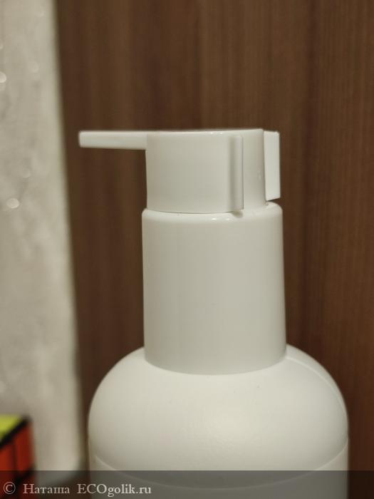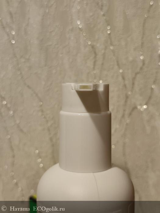 Флакон выполнен из белого пластика и оснащён удобным дозатором. Есть фиксирующее полукольцо: