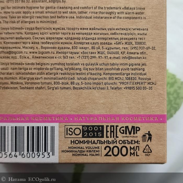 Состав натурального геля для интимной гигиены для мягкого очищения и комфорта указан как на коробке, так и на этикетке флакона.