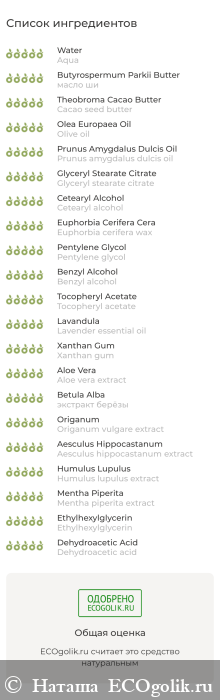 Aqua (вода дистиллированная), Вutyrospermium parkii (shea) butter (масло ши), Cacao (cocoa) seed butter (масло какао), Olive oil (масло оливковое), Prunus amygdalus dulcis (sweet almond) oil (масло миндаля), Glyceryl stearate citrate (глицерил стеарат цитрат), Сetearyl alcohol (цетилстеариловый спирт), Euphorbia cerifera (candelilla) wax (воск канделильский), Pentylene glycol* (пентилен гликоль), Benzyl alcohol (бензиловый спирт), Tocopheryl acetate (витамин Е), Lavender essential oil (эфирное масло лаванды), Mentha piperita (peppermint) essential oil (эфирное масло мяты), Xanthan gum (ксантановая камедь), Aloe vera extract (экстракт алоэ вера), Betula pubescens echr. extract (экстракт берёзового листа), Origanum vulgare extract (экстракт душицы), Aesculus hippocastanum extract (экстракт каштана), Humulus lupulus extract (экстракт хмеля), Mentha piperita extract (экстракт мяты), Ethylhexylglycerin (этилгексилглицерин), Dehydroacetic acid (дегидроуксусная кислота).