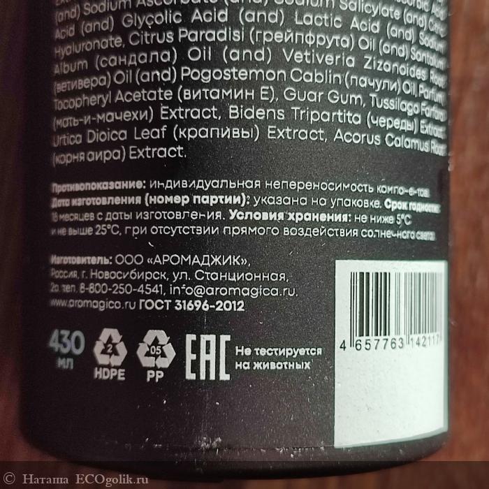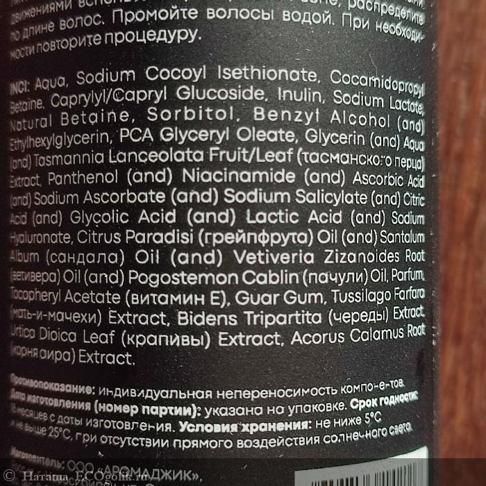 Aqua, Sodium Cocoyl Isethionate, Cocamidopropyl Betaine, Caprylyl/Capryl Glucoside, Inulin, Sodium Lactate, Natural Betaine, Sorbitol, Benzyl Alcohol (and) Ethylhexylglycerin, PCA Glyceryl Oleate, Glycerin (and) Aqua (and) Tasmannia Lanceolata Fruit/Leaf (тасманского перца) Extract, Panthenol (and) Niacinamide (and) Ascorbic Acid (and) Sodium Ascorbate (and) Sodium Salicylate (and) Citric Acid (and) Glycolic Acid (and) Lactic Acid (and) Sodium Hyaluronate, Citrus Paradisi (грейпфрута) Oil (and) Santalum Album (сандала) Oil (and) Vetiveria Zizanoides Root (ветивера) Oil (and) Pogostemon Cablin (пачули) Oil, Parfum, Tocopheryl Acetate (витамин Е), Guar Gum, Tussilago Farfara (мать-и-мачехи) Extract, Bidens Tripartita (череды) Extract, Urtica Dioica Leaf (крапивы) Extract, Acorus Calamus Root (корня аира) Extract.