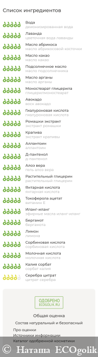 деионизированная вода, цветочная вода лаванды, масло абрикосовой косточки, масло какао, масло подсолнечника, масло арганы, глицерилмоностеарат, воск авокадо, гиалуроновая кислота (высоко- и низкомолекулярная), экстракт ромашки, экстракт крапивы, аллантоин, д-пантенол, гель алоэ вера, растительный глицерин, янтарная кислота, витамин Е, эфирные масла иланг-иланг, бергамота и лимона, сорбиновая кислота, молочная кислота, сорбат калия, цитрат серебра.