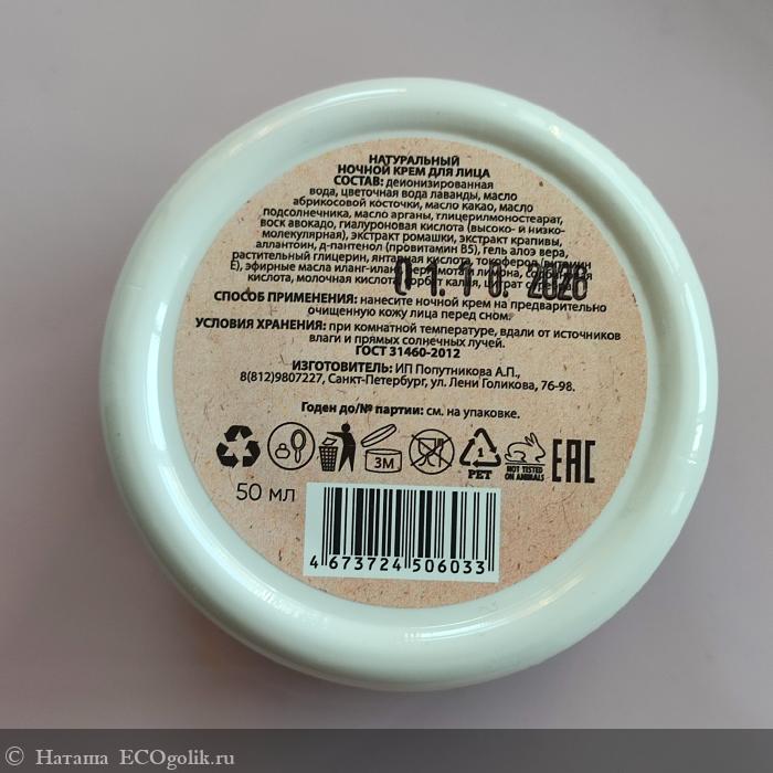 Натуральный ночной крем для лица интенсивно питает и увлажняет кожу, благодаря присутствию в составе арганового и других натуральных масел, гиалуроновой кислоты, геля алоэ вера и цветочной воды. За восстановление, омоложение, смягчение кожи отвечают Д-пантенол, витамин E и аллантоин.