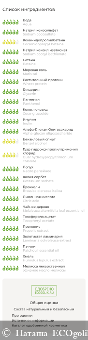Aqua (вода дистиллированная), Sodium cocosulfate* (кокосульфат натрия), Cocamidopropyl betaine (кокамидопропилбетаин), Sodium cocoyl isethionate (изетионат натрия), Betaine (бетаин), Maris sal (соль морская), Wheat protein (протеины пшеницы), Glycerin (глицерин), Panthenol (Д-пантенол), Coco-glucoside (кокоглюкозид), Inulin (инулин), Alpha-glucan oligosaccharide (альфа-глюкан олигосахарид), Benzyl аlcohol (бензиловый спирт), Guar hydroxypropyltrimonium chloride (гуар гидроксипропилтримония хлорид), Arctium Lappa root (Burdock) оil (масло репейное), Potassium sorbate (сорбат калия), Brassica oleracea italica (масло брокколи), Citric acid (лимонная кислота), Melaleuca alternifolia (tea tree) leaf essential oil (эфирное масло чайного дерева), Tocopheryl acetate (витамин Е), Propolis extract (экстракт прополиса), Laminaria ochroleuca extract (экстракт ламинарии), Patchouli essential oil (эфирное масло пачули), Humulus lupulus extract (экстракт хмеля), Melissa (Melissa citratum) leaf essential oil (эфирное масло мелиссы).