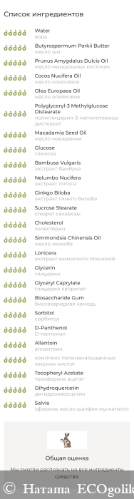 вода, масло ши, масло миндальных косточек, масло кокосовое, масло оливковое, полиглицерил-3-метилглюкозы дистеарат, масло макадамии, глюкоза, растительные экстракты бамбука, белой водяной лилии, лотоса и гинкго билоба (Bambusa Vulgaris, Nelumbo Nucifera Flower, Nymphaea Alba Root, Ginkgo biloba), стеарат сахарозы, холестерин, масло жожоба, экстракт жимолости японской, глицерин, глицерил каприлат, биосахаридная камедь, сорбитол, D-пантенол, аллантоин, комплекс полиненасыщенных жирных кислот (витамин F), токоферола ацетат (витамин Е), дигидрокверцетин, эфирное масло шалфея мускатного.