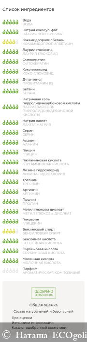 ВОДА, НАТРИЯ КОКОСУЛЬФАТ, КОКАМИДОПРОПИЛБЕТАИН, ЛАУРИЛ ГЛЮКОЗИД, ФИТОКЕРАТИН, КОКО-ГЛЮКОЗИД, ПРОВИТАМИН В5 (Д-ПАНТЕНОЛ), БЕТАИН, НАТРИЕВАЯ СОЛЬ ПИРРОЛИДОНКАРБОНОВОЙ КИСЛОТЫ, ЛАКТАТ НАТРИЯ, СЕРИН, АЛАНИН, ГЛИЦИН, ГЛУТАМИНОВАЯ КИСЛОТА, ЛИЗИНА ГИДРОХЛОРИД, ТРЕОНИН, АРГИНИН, ПРОЛИН, МЕТИЛ ГЛЮКОЗЫ ДИОЛЕАТ, ГЛИЦЕРИН, БЕНЗИЛОВЫЙ СПИРТ, БЕНЗОЙНАЯ КИСЛОТА, СОРБИНОВАЯ КИСЛОТА, МОЛОЧНАЯ КИСЛОТА, АРОМАТИЧЕСКАЯ КОМПОЗИЦИЯ