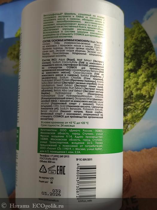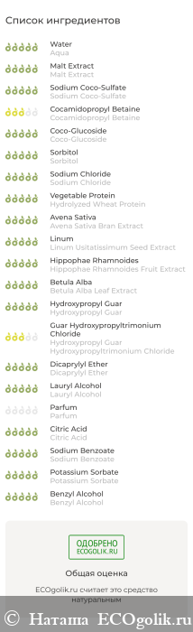 Aqua (Вода), Malt Extract (Экстракт ячменного солода), Sodium Coco-Sulfate (ПАВ из кокосового/пальмового масла, сертификат ECOSERT, разрешенный по стандарту COSMOS для производства органической косметики), Cocamidopropyl Betaine (ПАВ из кокосового масла), Coco-Glucoside (ПАВ из кокосового масла и глюкозы), Sorbitol (Сорбитол), Sodium Chloride (Соль пищевая), Hydrolyzed Wheat Protein (Протеины пшеницы), Avena Sativa Bran Extract (Экстракт овсяных отрубей), Linum Usitatissimum Seed Extract (Экстракт семян льна), Hippophae Rhamnoides Fruit Extract (Экстракт плодов облепихи), Betula Alba Leaf Extract (Экстракт листьев берёзы), Hydroxypropyl Guar (Полисахарид), Hydroxypropyl Guar Hydroxypropyltrimonium Chloride (Кондиционирующий агент), Dicaprylyl Ether (Дикаприлиловый эфир / эмолент из кокосового масла), Lauryl Alcohol (Лауриловый спирт / эмолент), Parfum (отдушка), Citric Acid (Лимонная кислота / регулятор показателя pH), Sodium Benzoate, Potassium Sorbate, Benzyl Alcohol (Бензоат натрия, Калия сорбат, Бензиловый спирт / консервант, разрешенный по стандарту COSMOS для производства органической косметики)