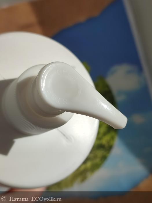 Флакон выполнен из белого пластика и оснащён дозатором с функцией open/stop: