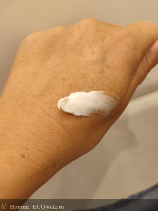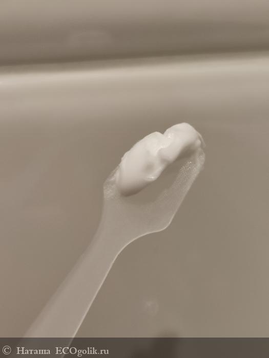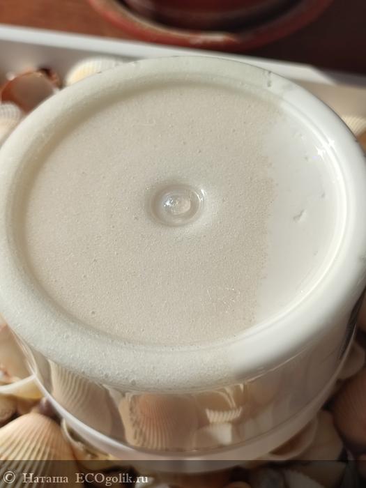 Консистенция крема (белая часть): кремовая, не густая и не жидкая, приятная на ощупь.