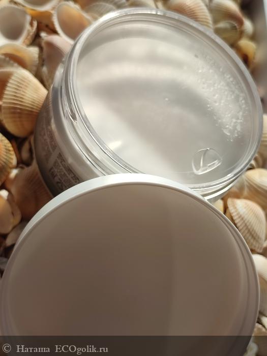 Скраб-крем находится в прозрачной пластиковой баночке. Сразу бросается в глаза двухфазность средства. Скраба (бежевый оттенок) в баночке больше, крема (белый цвет) гораздо меньше.