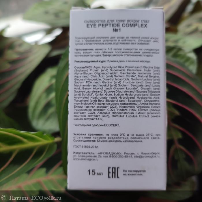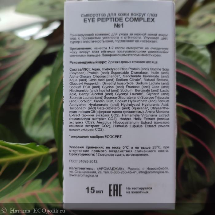 Состав сыворотки для кожи вокруг глаз "PEPTIDE COMPLEX №1" от отёков и тёмных кругов указан на картонной упаковке.
