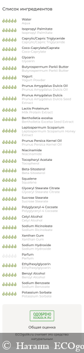 Aqua (Вода), Isopropyl Palmitate (Изопропилпальмитат), Caprylic/Capric Triglyceride (Каприлик/каприк триглицериды), Coco-Caprylate (Коко-каприлат / натуральный кокосовый эмолент, одобрен ECOCERT), Glycerin (Глицерин), Butyrospermum Parkii Butter (Масло ши), Yogurt Powder (Йогуртен), Prunus Amygdalus Dulcis Oil (Масло сладкого миндаля), Prunus Amygdalus Dulcis Seed Extract (Экстракт семян сладкого миндаля), Milk Protein Extract (Экстракт молочных протеинов) Bertholletia Excelsa Seed Extract (Экстракт бразильского ореха), Leptospermum Scoparium Honey Extract (Экстракт мёда манука), Prunus Persica Kernel Oil (Масло персиковое), Niacinamide (Ниацинамид / витамин В3), Tocopherol (Витамин Е), Beta-Sitosterol (Бета-ситостерол), Squalene (Сквален), Glyceryl Stearate Citrate, Sucrose Stearate, Polyglyceryl-4 Cocoate, Cetyl Alcohol, Sodium Ricinoleate (Глицерил стеарат цитрат, Стеарат сахарозы, Полиглицерил-4 кокоат, Цетиловый спирт, Рицинолеат натрия / натуральный эмульгатор Dub Base Expert), Xanthan Gum (Ксантановая камедь), Sodium Hydroxide (Натрия гидроксид), Parfum (Отдушка), Ethylhexylglycerin (Этилгексилглицерин), Benzyl Alcohol, Sodium Benzoate, Potassium Sorbate (Бензиловый спирт, натрия бензоат, калия сорбат / консерванты, разрешённые по стандарту COSMOS для производства органической косметики)