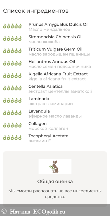 Масло миндальное, масло жожоба, масло зародышей пшеницы, масло семян подсолнечника, Volufiline™, экстракт кигелии африканской, экстракт центеллы азиатской, экстракт ламинарии, эфирное масло лаванды, морской коллаген, витамин Е. *Компоненты с ECO и BIO сертификатами