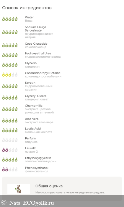 Состав не идеален. В нем присутствуют такие неодобренные анализатором компоненты как лауреат-2 и феноксиэтанол. Согласно сведениям от Экоголика указанные ингредиенты могут вызвать раздражение кожи и глаз, однако, у меня никакой отрицательной реакции на шампунь не было. При том, что я достаточно реактивная личность.