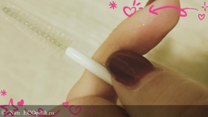 Кисточка встроена в пластиковую белую отвинчивающуюся крышку. Она удлиненная, состоит из мягких пучков ворсинок.