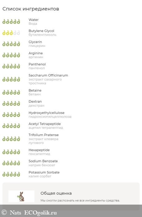 Состав неплох, но анализатору косметики не понравился бутиленгликоль. В карточке этого компонента значится, что он является консервантом и усилителем действия других веществ, а также может вызывать раздражение глаз и кожи.