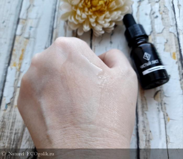 Консистенция легкая, но достаточно густая, она хорошо скользит и без труда распределяется не растягивая кожу. Впитывается достаточно быстро, не оставляя после себя неприятной липкости. Хотя в отличии от сыворотки «Интенсивное увлажнение» небольшая стянутость все же присутствует, но после запечатывания продукта кремом быстро проходит.