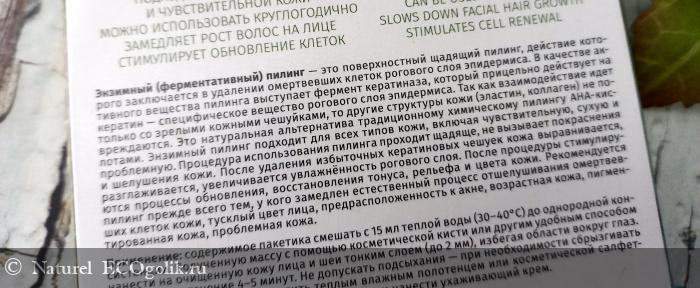 Хочу отметить, что информация о средстве дублируется и на пакетике с пилингом, а также более подробно расписана во вложенном буклете, причем на двух языках.