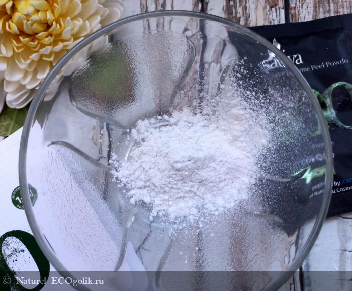 Итак, внутри сашетки находится белый порошок с черными вкраплениями. Помол очень мелкий, мне напоминает картофельный крахмал. Аромат нейтральный.