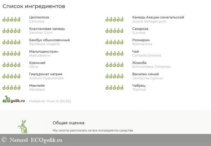 целлюлоза, камедь сенегальской акации, ксантановая камедь, сахароза, кератиназа, пудра бамбука, экстракт розмарина, мальтодекстрин, экстракт зеленого чая, силика, масло жожоба, гиалуронат натрия, экстракт василька, экстракт маклейи, экстракт тимьяна.