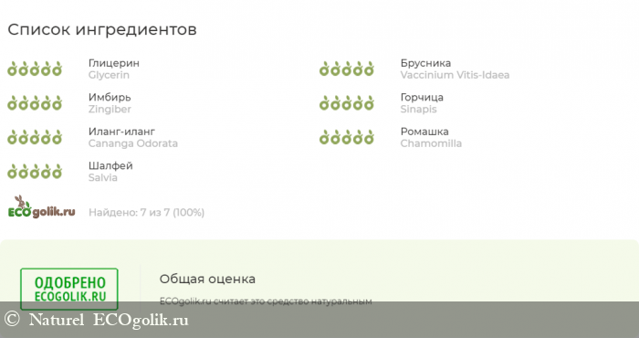 Glycerin (глицерин), Vaccinium vitis-idaea fruit extract (экстракт брусники), Zingiber officinale (ginger) extract (экстракт имбиря), Brassica juncea oil (масло горчицы), Cananga odorata essential oil (эфирное масло иланг-иланг), Matricaria recutita flower oil (эфирное масло ромашки), Clary sage essential oil (эфирное масло шалфея)