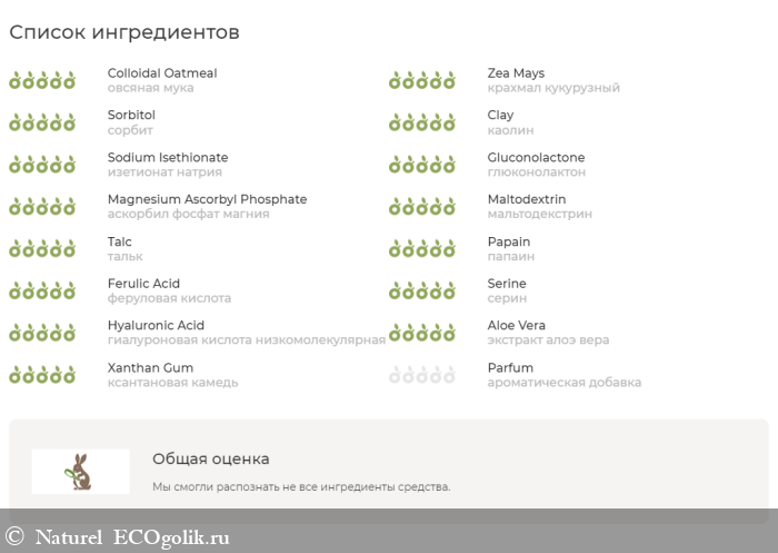 рисовый шелк, овсяная мука, крахмал кукурузный, сорбит, каолин, изетионат натрия, глюконолактон, аскорбилфосфат магния (стабильная форма витамина С), мальтодекстрин, тальк, папаин, феруловая кислота, серин, L-глутаминовая кислота, гиалуроновая кислота низкомолекулярная, экстракт алоэ вера, ксантановая камедь, ароматическая добавка.