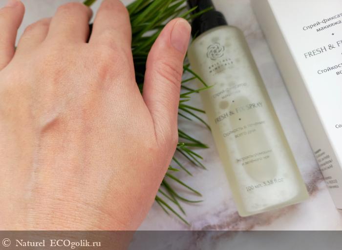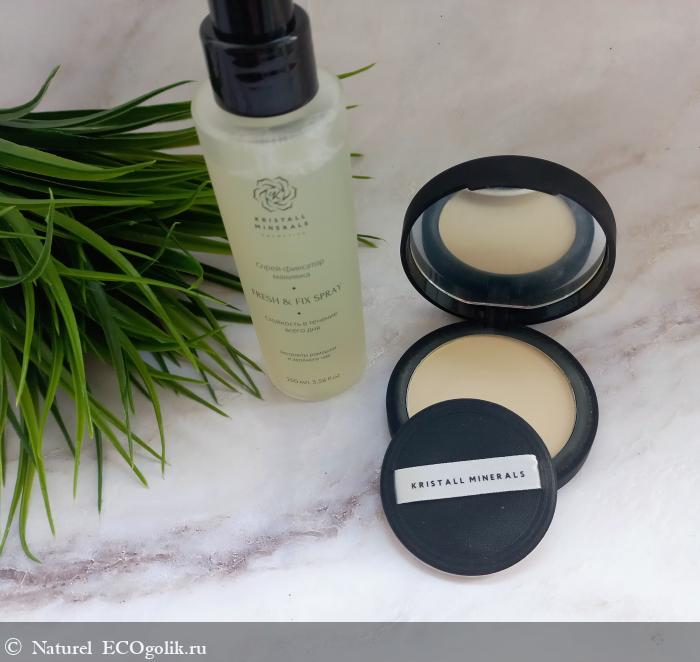 На фото выше я использовала для макияжа компактную основу Kristal Minerals, но компактные средства сами по себе гораздо комфортнее наносятся на кожу, поэтому больше всего мне нравится как спрей работает именно с рассыпчатыми текстурами.
