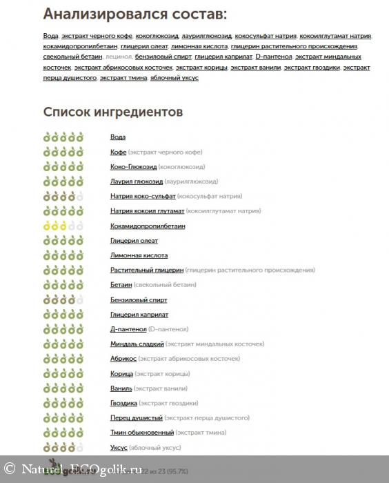 Вода, экстракт черного кофе, мягкая моющая основа*, глицерил олеат, лимонная кислота, глицерин растительного происхождения, свекольный бетаин, лецинол, бензиловый спирт, глицерил каприлат, D-пантенол (провитамин В5), экстракт миндальных косточек, экстракт абрикосовых косточек, экстракт корицы, экстракт ванили, экстракт гвоздики, экстракт перца душистого, экстракт тмина, яблочный уксус.