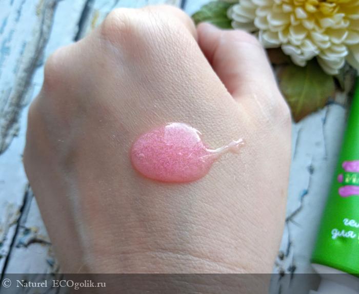Само средство представляет собой достаточно жидкий прозрачный гель с вкраплениями розовых скрабирующих частиц. Смотрится очень красиво.
