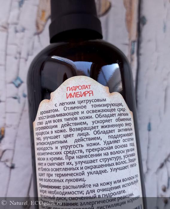В обоих случаях гидролат имбиря проявляет свои свойства по максимуму, отлично тонизируя кожу, выравнивая тон лица, придавая матовость; а волосам он придает красивый блеск и дополнительное смягчение.