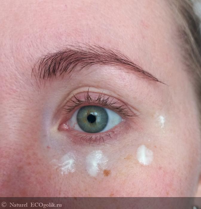 Продукт очень хорошо держит форму и легко распределяется по нежной коже вокруг глаз, не растягивая ее и не утяжеляя. Впитывается достаточно быстро, какое-то время нужно выждать, прежде чем наносить косметику, но тем не менее крем не жирнит кожу, не делает ее липкой, скорее ему нужно просто дать время для усаживания.