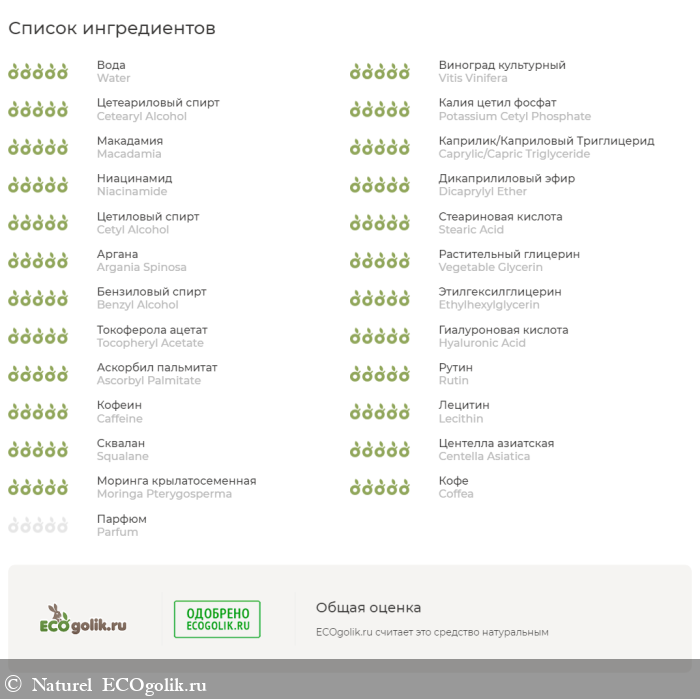 ВОДА, МАСЛО ВИНОГРАДНОЙ КОСТОЧКИ, ЦЕТЕАРИЛОВЫЙ СПИРТ, ЦЕТИЛФОСФАТ КАЛИЯ, МАСЛО МАКАДАМИИ, КАПРИЛИК/КАПРИК ТРИГЛИЦЕРИДЫ, НИАЦИНАМИД, ДИКАПРИЛИЛОВЫЙ ЭФИР, ЦЕТИЛОВЫЙ СПИРТ, СТЕАРИНОВАЯ КИСЛОТА, МАСЛО АРГАНЫ, ГЛИЦЕРИН РАСТИТЕЛЬНЫЙ, БЕНЗИЛОВЫЙ СПИРТ, ЭТИЛГЕКСИЛГЛИЦЕРИН, ТОКОФЕРОЛА АЦЕТАТ (ВИТАМИН Е), ГИАЛУРОНОВАЯ КИСЛОТА, АСКОРБИЛПАЛЬМИТАТ, РУТИН (ВИТАМИН Р), КОФЕИН, ЛЕЦИТИН, СКВАЛАН, ЭКСТРАКТ ЦЕНТЕЛЛЫ АЗИАТСКОЙ, ЭКСТРАКТ МОРИНГИ, ЭКСТРАКТ ЗЕЛЕНОГО КОФЕ, АРОМАТИЧЕСКАЯ КОМПОЗИЦИЯ