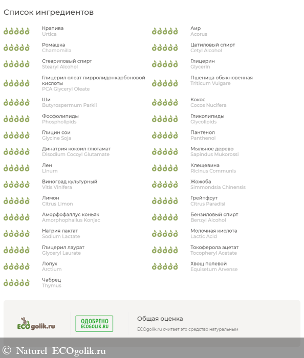 Urtica Dioica Leaf (крапивы) Infusion, Acorus Calamus Root (корня аира) Infusion, Arctium Lappa Root (корня лопуха) Infusion, Equisetum Arvense Leaf (хвоща полевого) Infusion, Matricaria Chamomilla Flower (ромашки) Infusion, Linum Usitatissimum Seed (семян льна) Infusion, Citrus Limon (Lemon) Fruit Juice (Powder), Cetyl Alcohol (цетиловый спирт), Stearyl Alcohol (стеариловый спирт), Glycerin, PCA Glyceryl Oleate (глицерил олеат пирролидонкарбоновой кислоты), Hydrolyzed Wheat Protein (протеины пшеницы), Butyrospermum Parkii (Shea Butter) (масло ши) Oil, Cocos Nucifera (Coconut) (кокоса) Oil, Phospholipids (and) Glycine Soja (Soybean) Oil (and) Glycolipids (and) Glycine Soja (Soybean) Sterols, Pantenol, Disodium Cocoyl Glutamate, Sapindus Mukorossi (мыльного ореха) Extract, Linum Usitatissimum Seed (семян льна) Oil, Arctium Lappa Root (репейное) Oil, Ricinus Communis (Castor) Seed (касторовое) Oil, Vitis Vinifera Seed (виноградной косточки) Oil, Simmondsia Chinensis (Jojoba) Seed (жожоба) Oil, Citrus Limon (Lemon) Oil, Citrus Paradisi (Grapefruit) Oil, Amorphophallus Konjac Root Powder, Benzyl Alcohol, Sodium Lactate (натриевая соль молочной кислоты), Lactic Acid (молочная кислота), Glyceryl Laurate, Tocopheryl Acetate (витамин Е), Arctium Lappa (корня лопуха) SC-CO2 Extract, Equisetum Arvense (хвоща полевого) SC-CO2 Extract, Thymus Serpyllum (чабреца) SC-CO2 Extract