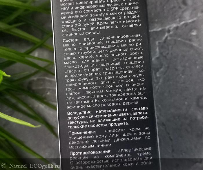 вода деионизированная, масло оливковое, глицерин растительного происхождения, масло рисовых отрубей, цетеариловый спирт, масло карите, масло лесного ореха, масло клещевины, цетеариловые глюкозиды (из пшеницы), глицерил стеарат, стеарат сахарозы, сквалан, каприлик/каприк триглицериды, экстракт фукуса, экстракт икры некультивированного дикого лосося, экстракт жимолости японской, глюконолактон, глюконат магния, лактат калия, рисовый воск, токоферола ацетат (витамин Е), ксантовая камедь, эфирное масло розового дерева.