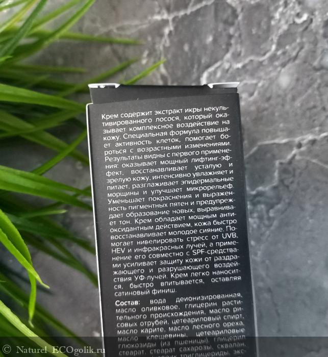 крем содержит экстракт икры некультивированного лосося, который оказывает комплексное воздействие на кожу. Специальная формула повышает активность клеток, помогает бороться с возрастными изменениями. Результаты видны с первого применения: оказывает мощный лифтинг-эффект, восстанавливает усталую и зрелую кожу, интенсивно увлажняет и питает, разглаживает эпидермальные морщины и улучшает микрорельеф. Уменьшает покраснения и выраженность пигментных пятен и предупреждает образование новых, выравнивает тон. Крем обладает мощным антиоксидантным действием, кожа быстро восстанавливает молодое сияние. Помогает нивелировать стресс от UVB, HEV и инфракрасных лучей, а применение его совместно с SPF-средствами усиливает защиту кожи от раздражающего и разрушающего воздействия УФ-лучей. Крем легко наносится, быстро впитывается, оставляя сатиновый финиш.