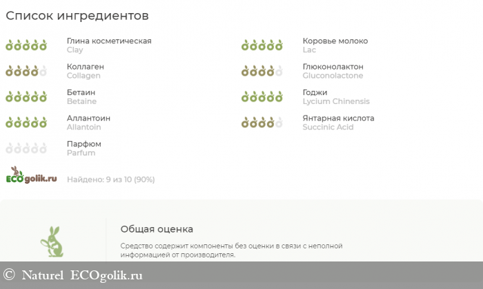 глина голубая, сухое молоко, коллаген морской, янтарь балтийский измельчённый, глюконолактон, бетаин, экстракт ягод годжи, аллантоин, янтарная кислота, парфюмерная композиция.