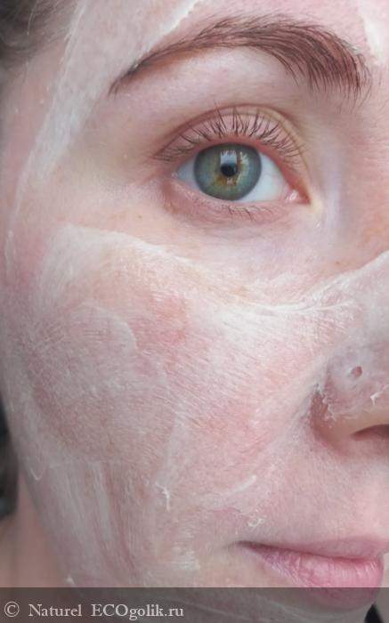 Маска очень комфортно распределяется по коже ровным слоем, с течением времени она на высыхает, не стягивает кожу и в целом не доставляет никакого дискомфорта моей чувствительной коже. Смывается без труда простой теплой водой без подручных средств.