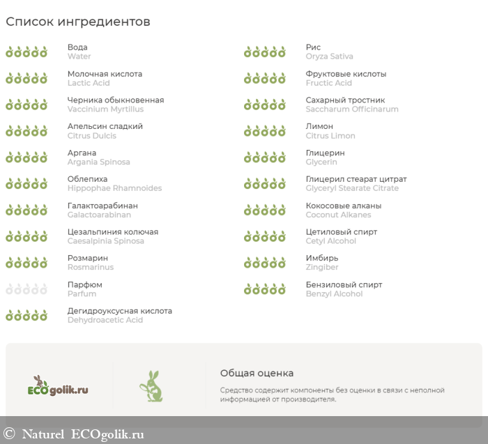 вода, рисовый крахмал, масло рисовых отрубей, молочная кислота, комплекс натуральных АНА-кислот из экстрактов черники, сахарного тростника, апельсина, лимона и сахарного клена, масло аргана, глицерин, СО2-экстракт косточек облепихи, глицерил стеарат цитрат («зеленый» эмульгатор), энзимы тыквы, арабиногалактан, кокосовые алканы, камедь цезальпинии, цетиловый спирт, натуральный эмолент, СО2-экстракт розмарина, смесь натуральных токоферолов, антимикробный пептид из редиса, эфирное масло имбиря, натуральная ароматическая композиция, бензиловый спирт, дегидроацетовая кислота (консерванты Органик).