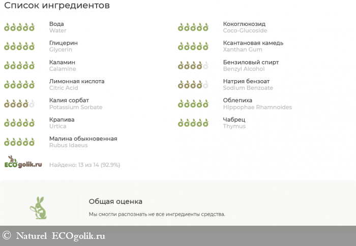 Aqua (Вода), Coco-glucoside (Мягкое растительное ПАВ), Glycerin (Глицерин), Xanthan Gum (Ксантановая камедь), Calamine (Каламин), Benzyl Alcohol (Бензиловый спирт), Arome (Натуральная отдушка), Citric acid (Лимонная кислота), Sodium Benzoate (Натрия бензоат), Potassium Sorbate (Калия сорбат), Hippophae rhamnoides Extract (Экстракт облепихи), Urtica dioica. Extract (Экстракт крапивы), Thymus serpyllum L. Extract (Экстракт чабреца), Rubus idaeus Extract (Экстракт малины)