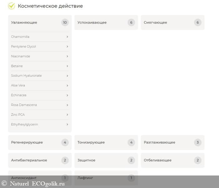 Кстати, не зря тонер получил название «Увлажняющий», ведь согласно анализатору сервиса проверки Ecogolik его косметическое действие направлено именно на увлажнение кожи, и практика это только подтверждает.
