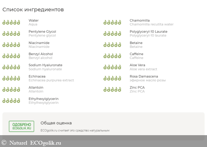 Aqua (вода дистиллированная), Chamomilla recutita water (гидролат ромашки), Pentylene glycol (пентилен гликоль), Polyglyceryl-10 laurate (полиглицерил-10 лаурат), Niacinamide (ниацинамид), Betaine (бетаин), Benzyl alcohol (бензиловый спирт), Caffeine (кофеин), Sodium hyaluronate (гиалуронат натрия), Aloe vera extract (экстракт алоэ вера), Echinacea purpurea extract (экстракт эхинацеи), Rosa gallica L. essential oil (эфирное масло розы), Allantoin (аллантоин), Zinc PCA (цинк ПКК), Ethylhexylglycerin (этилгексилглицерин).