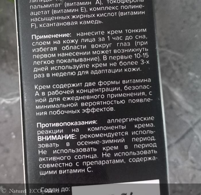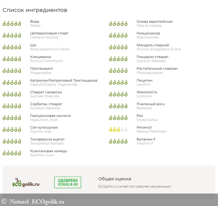 Состав можно сказать идеальный, если не считать ретинол, который получил 3 яблочка за то, что имеет ряд противопоказаний, а именно не рекомендован беременным и людям с кожными онкологическими заболеваниями.
